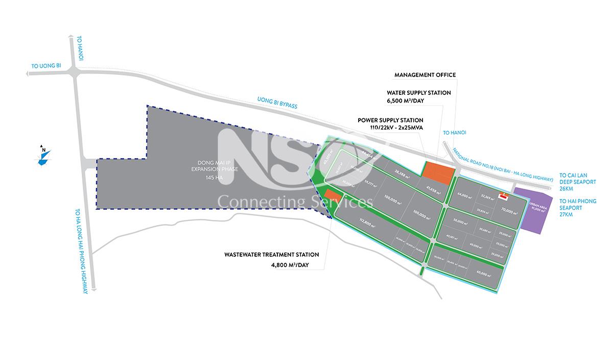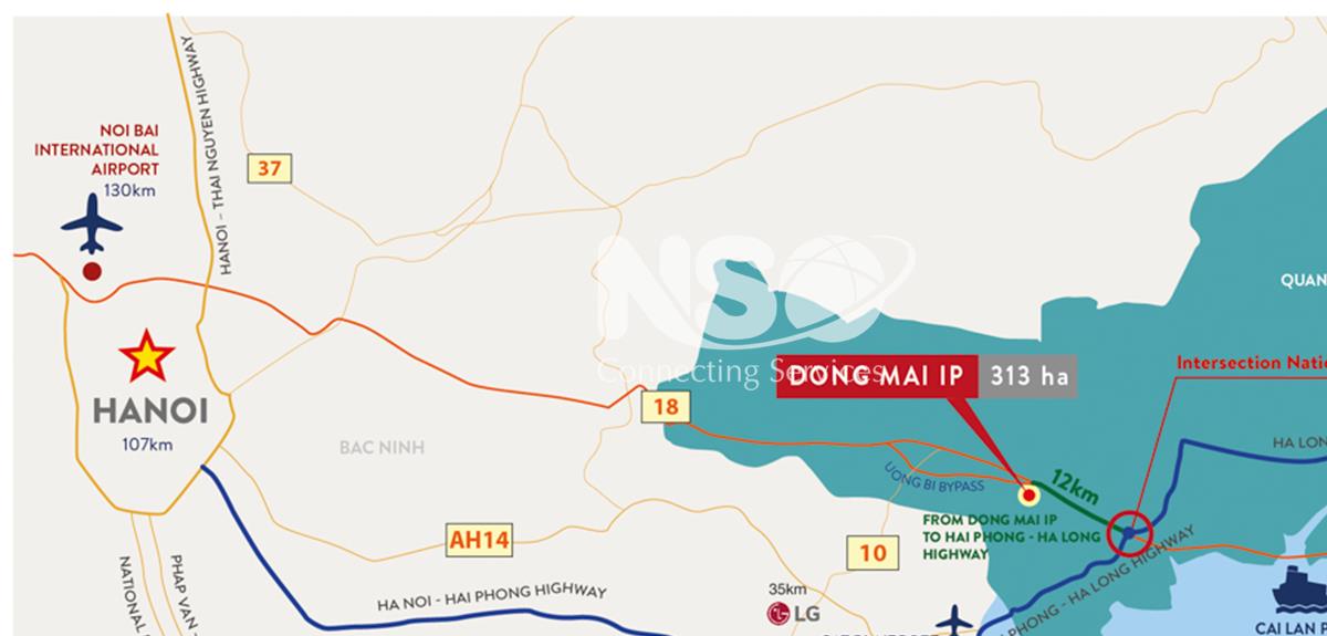 - By road: Located on National Highway 18 from Hanoi to Mong Cai International Border Gate; Connecting with Hai Phong city (about 40 km from Hai Phong city center) and Northern coastal provinces along National Highway 10. Connecting with Ha Long - Hai Phong highway through Dai Yen intersection about 13 km.