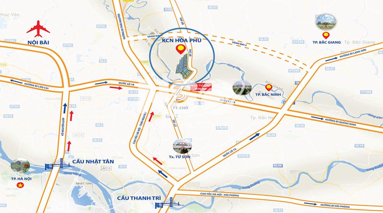 35 km from Bac Giang city, 45 km from Hanoi capital, 30 km from Noi Bai international airport, 120 km from Hai Phong port, 130 km from Huu Nghi Quan border gate.