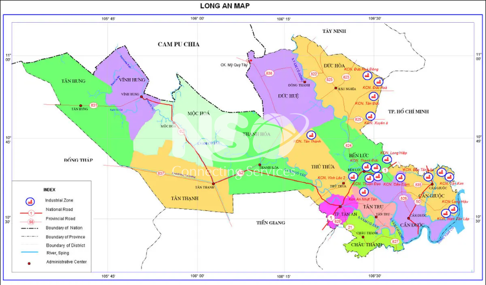 Long An is a province located in the southern key economic region and is the gateway connecting the Southeast with the Mekong Delta region, especially sharing the border with Ho Chi Minh City, by a system of national highways: 1,50, 62, N1, N2 (Ho Chi Minh Road). With its strategic location, the gateway connecting the East – Southwest, Long An is identified as a dynamic economic region that plays a particularly important role in Vietnam's economic development strategy..