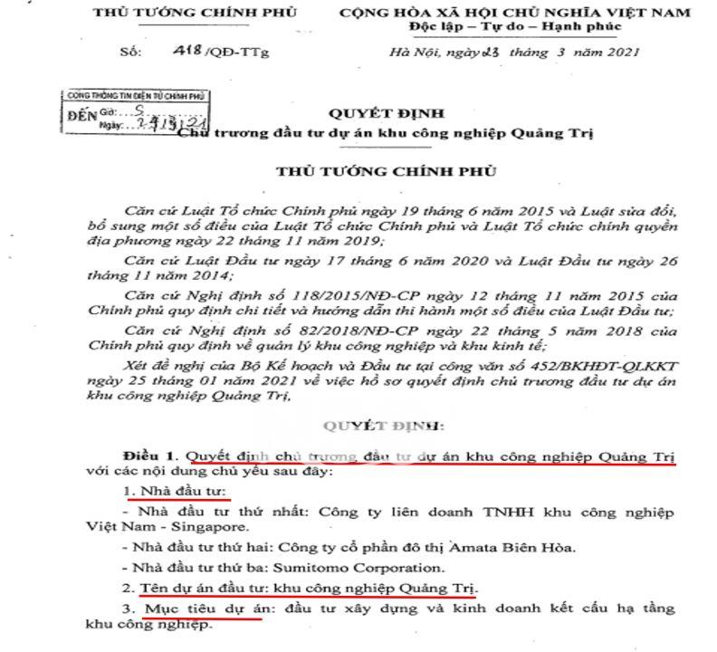 On March 23, 2021, the Prime Minister signed the decision on investment policy in Quang Tri industrial park project number: 418/QD-TTG