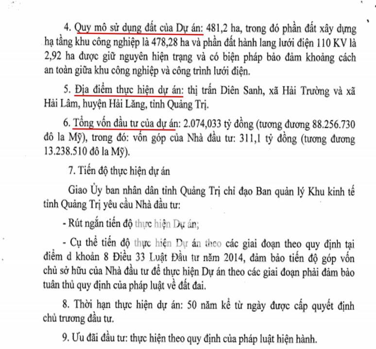 To decide on investment policy in Quang Tri industrial park project with the following main contents: