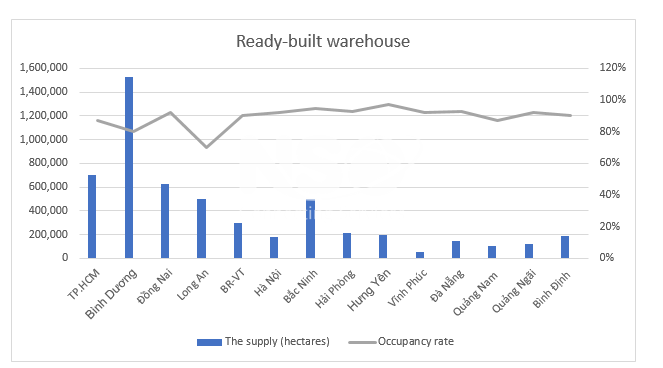 The ready-built warehouse market is still relatively new in the industrial real estate segment, due to the development that follows the activities of manufacturing enterprises. However, the Covid-19 pandemic has created a positive impact on the logistics market, as of Q1 2022, the supply of ready-built warehouses in all 14 provinces in the North, Central and South reached 5,245,943 m2, with a occupancy rate of about 90%.