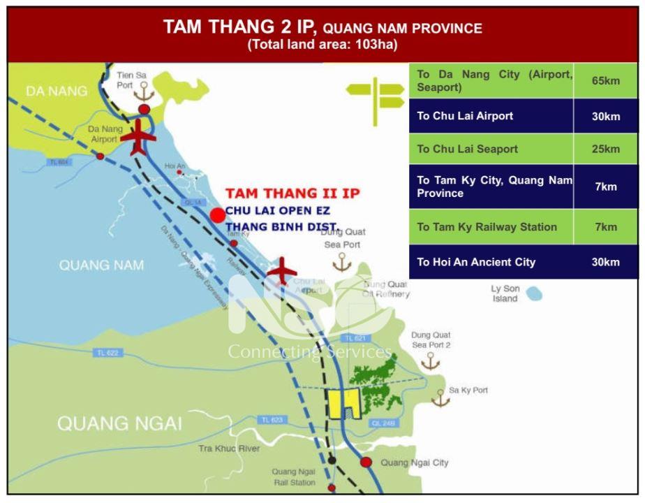 Truong Hai Port: 20km, Ky Ha Port: 30km, Dung Quoc Port: 55km, Tien Sa Da Nang Port: 65km