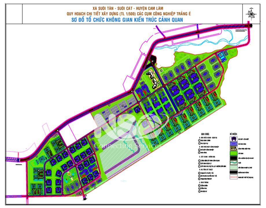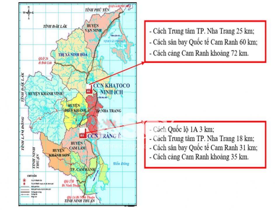 - Geographical location: Trang E industrial cluster is located in Suoi Tan and Suoi Cat communes, Cam Lam district, Khanh Hoa province. Located 3km from National Highway 1A axis, from the city center. Nha Trang is 18km, 15km from Cam Ranh International Airport and about 35km from Cam Ranh Port.