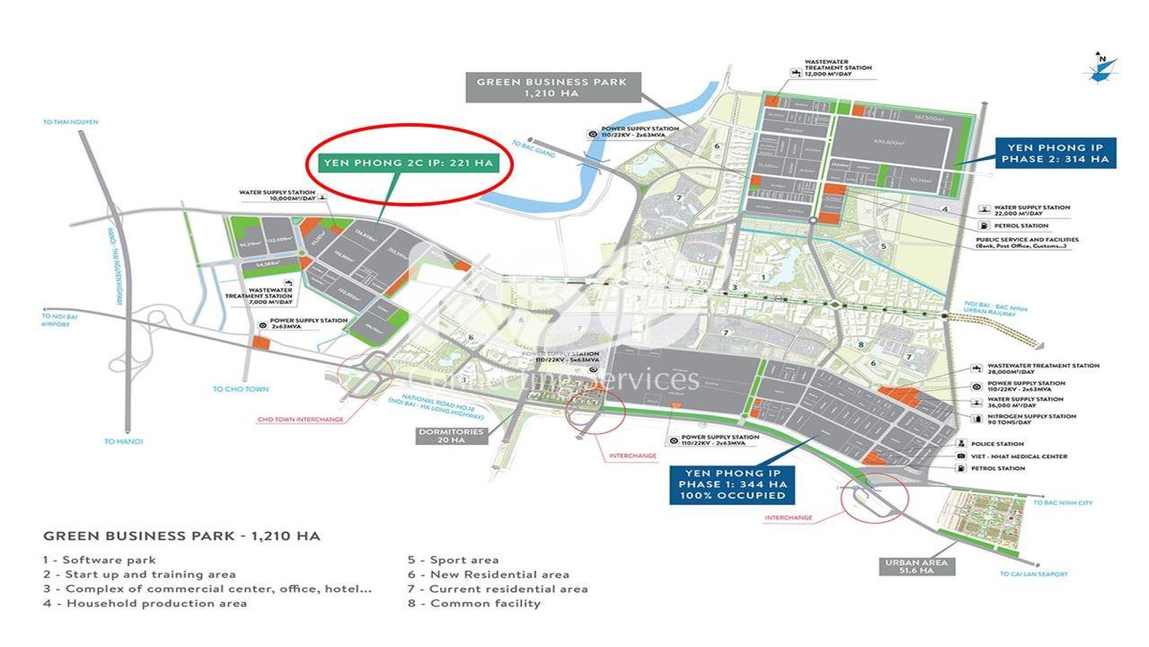 Yen Phong 2 Industrial Park and Urban Area was established under the Prime Minister's Decision No. 856 /TTg-CN dated June 28, 2007 with a total planning area of 1,200 ha, of which the area of the Industrial Park - for production area is 1,000 ha, urban area is 200 ha.